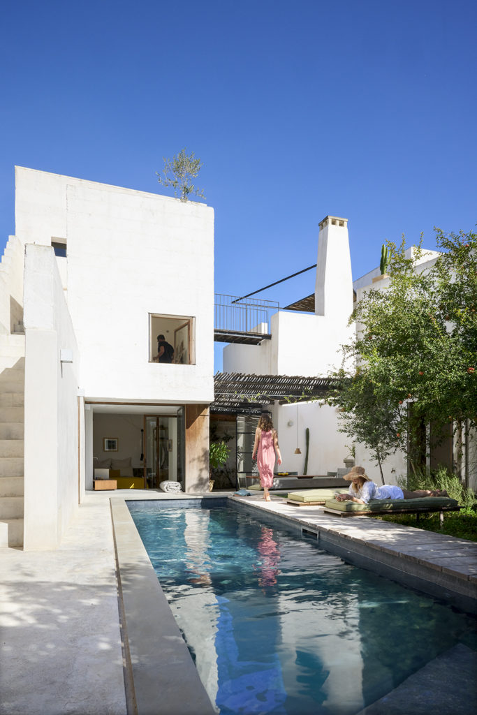 Acquis en 2014, l’ensemble a été entièrement repensé par l’architecte qui a réussi à préserver son authenticité tout en y apportant de profondes modifications. Afin d’accueillir toute la famille, la maison est composée de quatre grandes chambres indépendantes avec salles de bain, une pièce en mezzanine et un petit atelier qu’Isabelle utilisait pour peindre et travailler. Le tout desservi par un patio central à ciel ouvert, protégé par des brise-soleils en châtaignier. Cette cour commune accueille une cuisine d’extérieur avec une grande table conviviale en olivier faite sur mesure, elle jouxte la piscine et le jardin auxquels accèdent directement les chambres de plein pied.