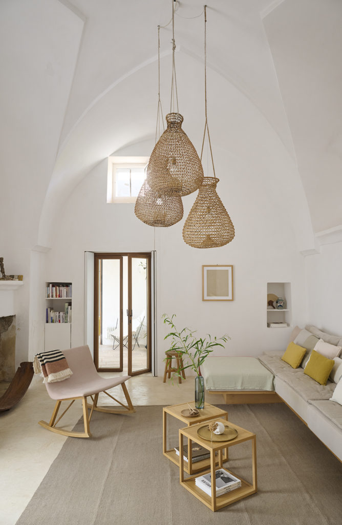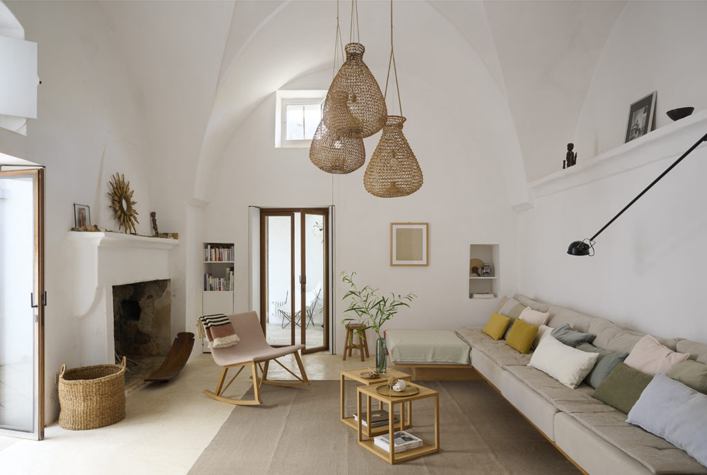 Presque huit ans de travaux ont été nécessaires pour mener à bien la construction de nouveaux habitacles, de l’isolation, l’installation d’une pompe à chaleur pour la climatisation et de panneaux solaires pour l’eau chaude. Les poutres ont été renforcées et les murs blanchis à la chaux, comme c’est l’usage dans cette région. L’ouverture du mur entre les deux pièces du corps central a permis de créer un seul grand volume dont une cuisine et un salon aux belles voûtes en étoile typiques de la région. Pour ne pas toucher aux façades historiques, toute l’isolation a été faite par l’intérieur avec du chanvre naturel. Afin de respecter au maximum l’existant et n’utiliser que des techniques et des matériaux locaux, les sols ont été refaits en « cocciopesto », une méthode ancestrale typique du Salento qui mélange chaux et pierres concassées sur une épaisseur de 30cm ! Témoignant de son amour pour cette région, Isabelle Valazza Vallet a mis en avant les savoir-faire artisanaux, tout en dotant la maison de tous les équipements modernes.