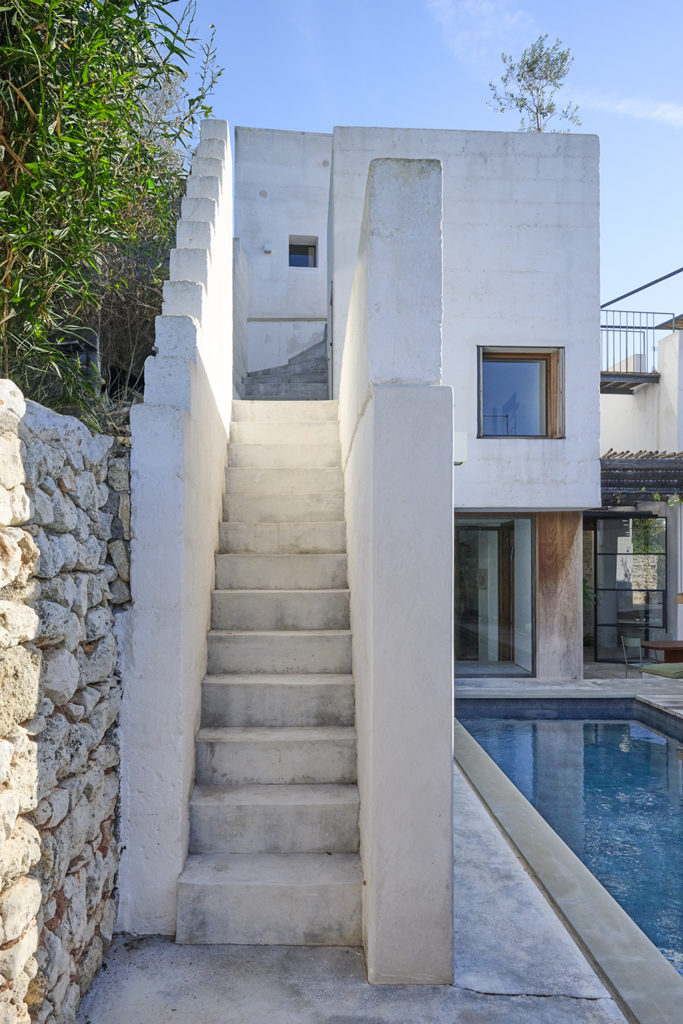 Naturellement fraîche grâce à ses murs épais et ses plafonds en voûtes, la maison se déploie sur divers niveaux offrant des points de vue panoramiques à 360 degrés. Les toits-terrasses offrent de beaux dégagements sur la ville et sur les architectures caractéristiques de cette région riche en histoire. A l’horizon on aperçoit les scintillements de la mer située à une dizaine de minutes en voiture. Adepte de méditation, Isabelle a créé un deck en iroko surplombant la maison, idéal pour pratiquer le yoga, contempler le ciel ou siroter un apéro. Les toits des maisons environnantes déploient leurs entrelacs d’aplats blancs, gris et beiges, dans un camaïeu nuancé en pierres brutes. Ouverte sur le ciel mais fortement ancrée au sol, la propriété est délimitée par des murs qui créent un univers caché et secret.